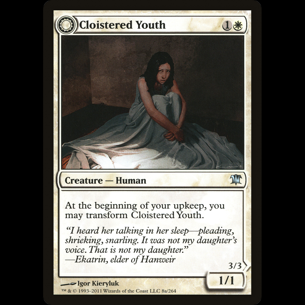 At the beginning of your upkeep, you may transform Cloistered Youth. // At the beginning of your end step, you lose 1 life.