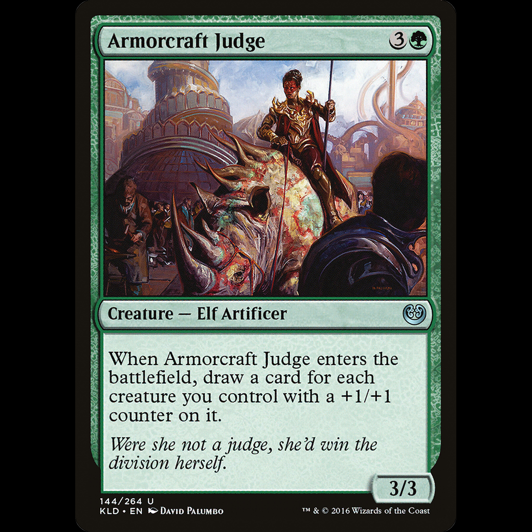 When Armorcraft Judge enters the battlefield, draw a card for each creature you control with a +1/+1 counter on it.