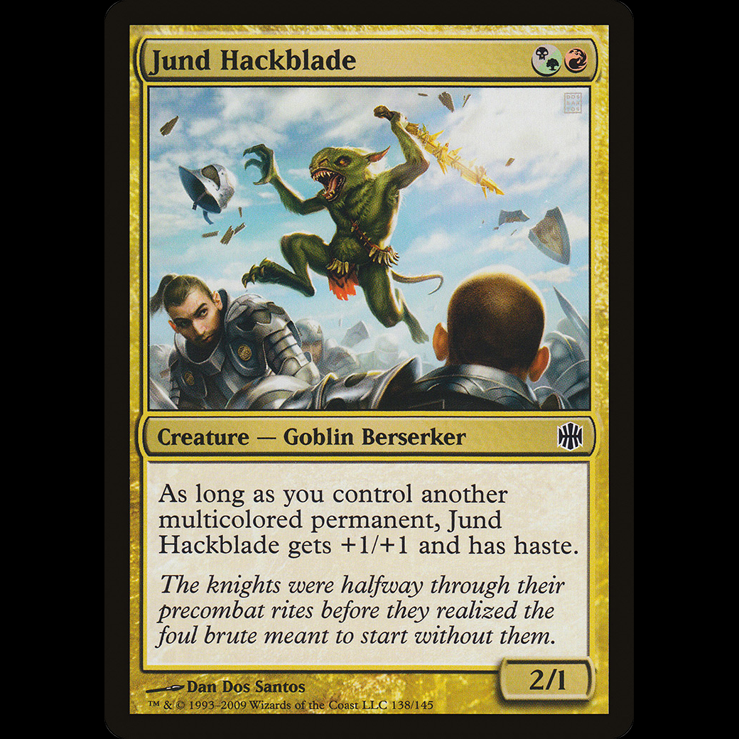 As long as you control another multicolored permanent, Jund Hackblade gets +1/+1 and has haste.