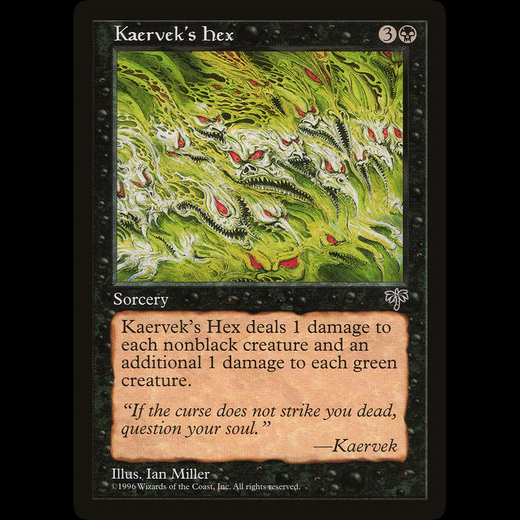 Kaervek's Hex deals 1 damage to each nonblack creature and an additional 1 damage to each green creature.