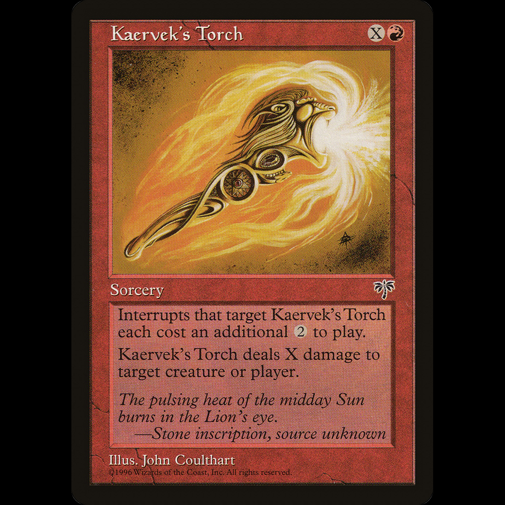 As long as Kaervek's Torch is on the stack, spells that target it cost more to cast.