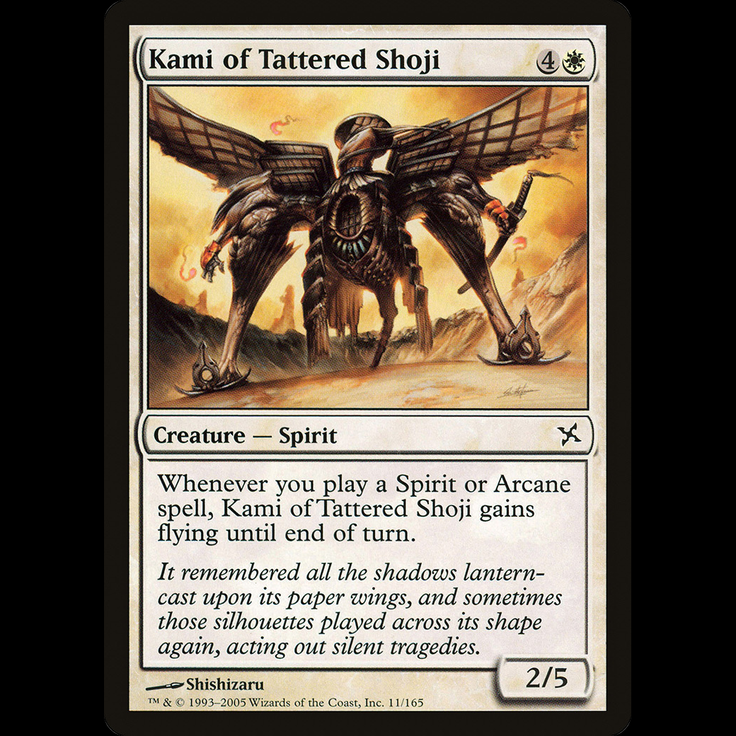 Whenever you cast a Spirit or Arcane spell, Kami of Tattered Shoji gains flying until end of turn.
