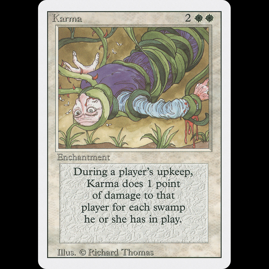 At the beginning of each player's upkeep, Karma deals damage to that player equal to the number of Swamps they control.