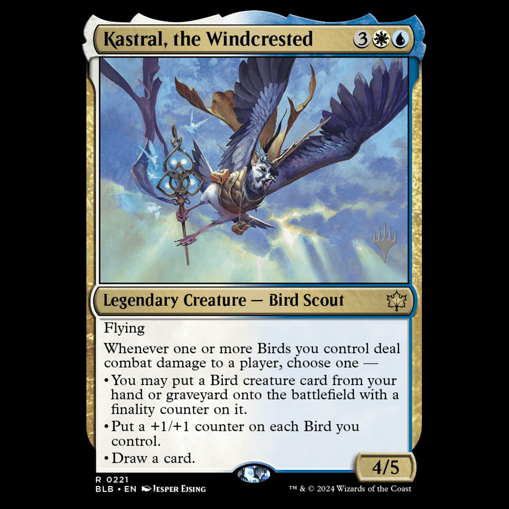 MTG Kastral, the Windcrested Bloomburrow Promos pblb#221p Flying Whenever one or more Birds you control deal combat damage to a player, choose one — • You may put a Bird creature card from your hand or graveyard onto the battlefield with a finality counter on it. • Put a +1/+1 counter on each Bird you control. • Draw a card.