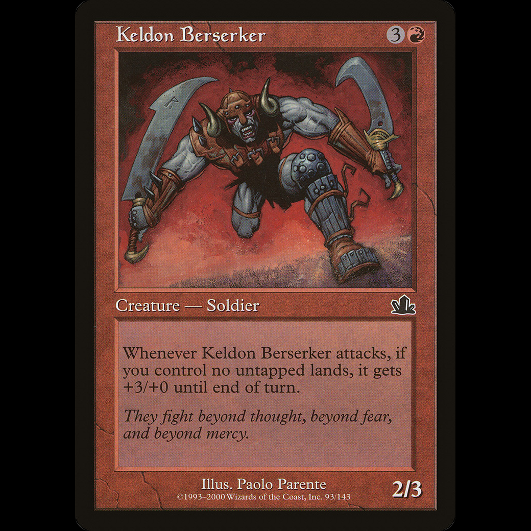 Whenever Keldon Berserker attacks, if you control no untapped lands, it gets +3/+0 until end of turn.
