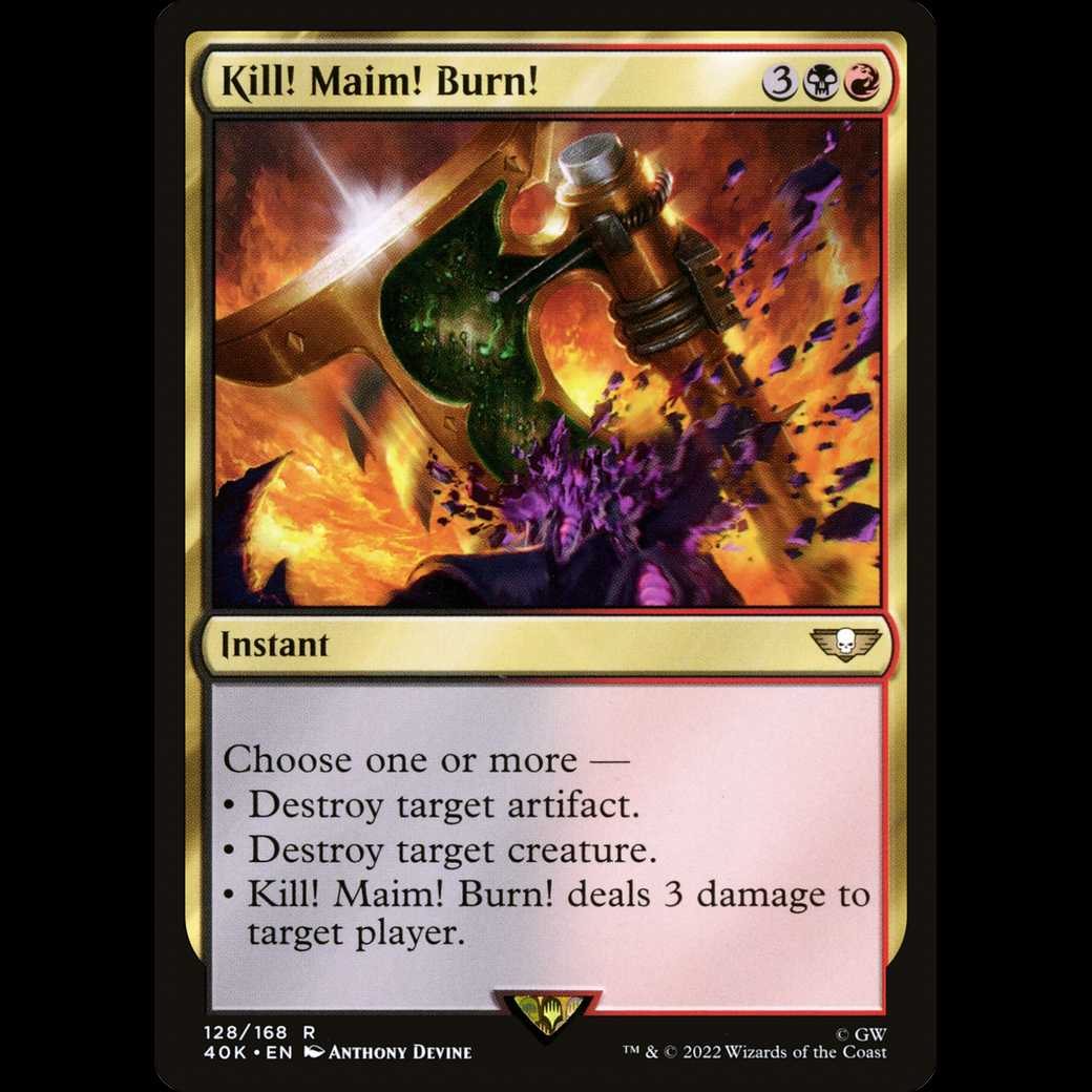 MTG Kill! Maim! Burn! Warhammer 40,000 Commander 40k#128 Choose one or more — • Destroy target artifact. • Destroy target creature. • Kill! Maim! Burn! deals 3 damage to target player.