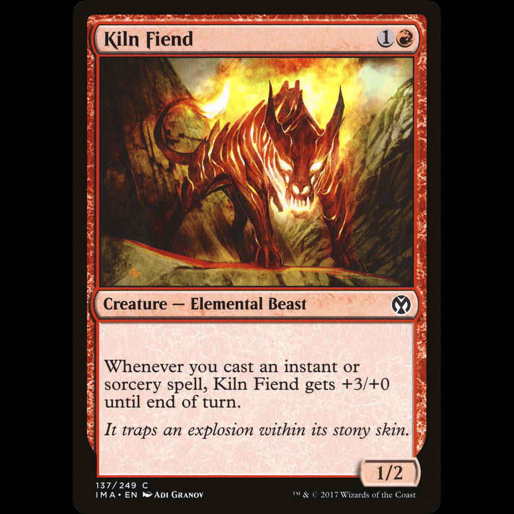 MTG Kiln Fiend Iconic Masters ima#137Whenever you cast an instant or sorcery spell, this creature gets +3/+0 until end of turn.
