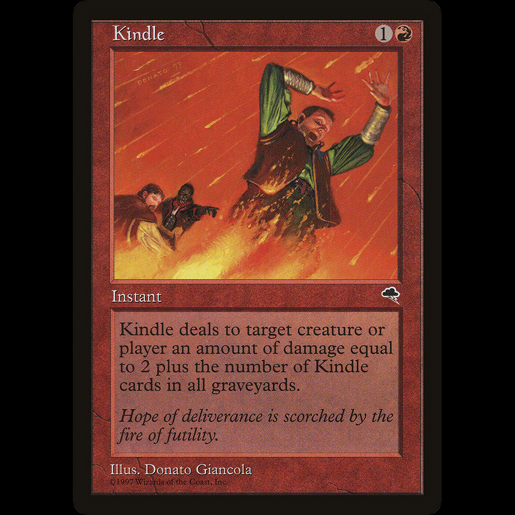 Kindle deals X damage to any target, where X is 2 plus the number of cards named Kindle in all graveyards.