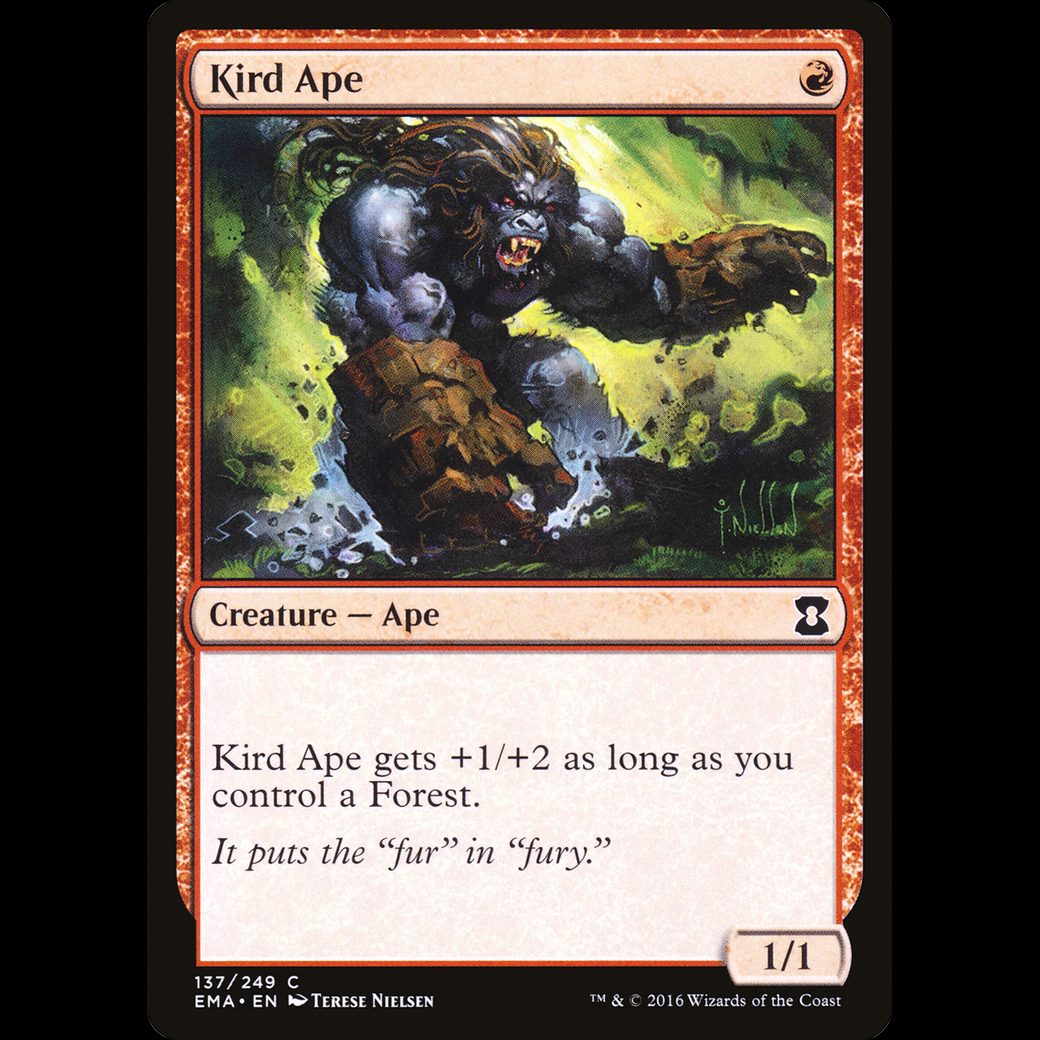 MTG Kird Ape Eternal MastersKird Ape gets +1/+2 as long as you control a Forest.