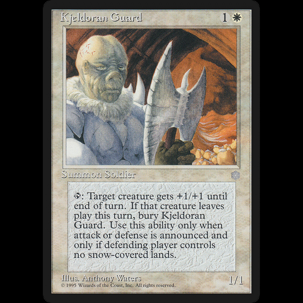 : Target creature gets +1/+1 until end of turn. When that creature leaves the battlefield this turn, sacrifice Kjeldoran Guard. Activate only during combat and only if defending player controls no snow lands.