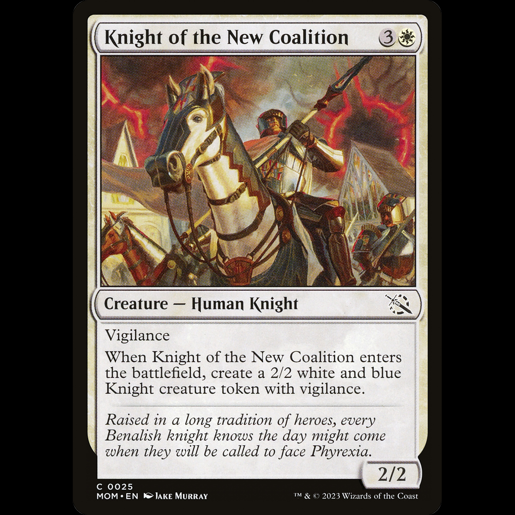 When Knight of the New Coalition enters the battlefield, create a 2/2 white and blue Knight creature token with vigilance.