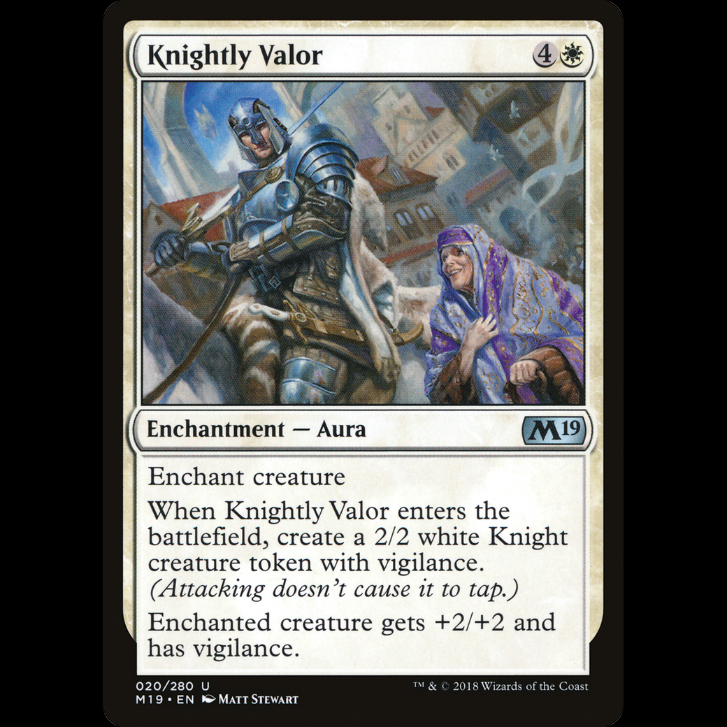 When Knightly Valor enters the battlefield, create a 2/2 white Knight creature token with vigilance. (Attacking doesn't cause it to tap.)