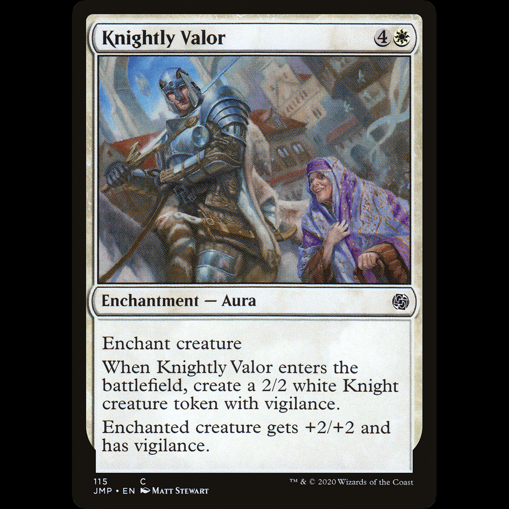 When this Aura enters, create a 2/2 white Knight creature token with vigilance. (Attacking doesn't cause it to tap.)