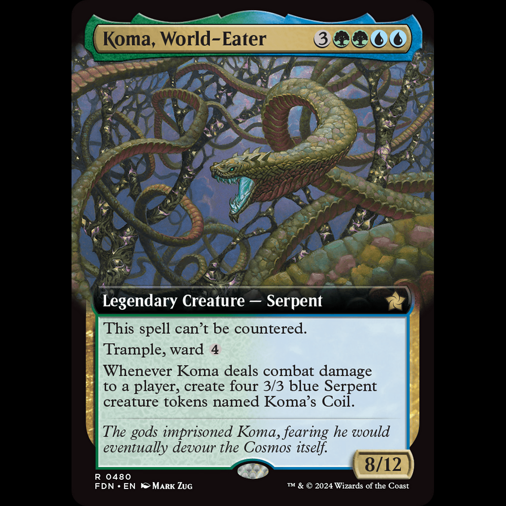 Whenever Koma deals combat damage to a player, create four 3/3 blue Serpent creature tokens named Koma's Coil.