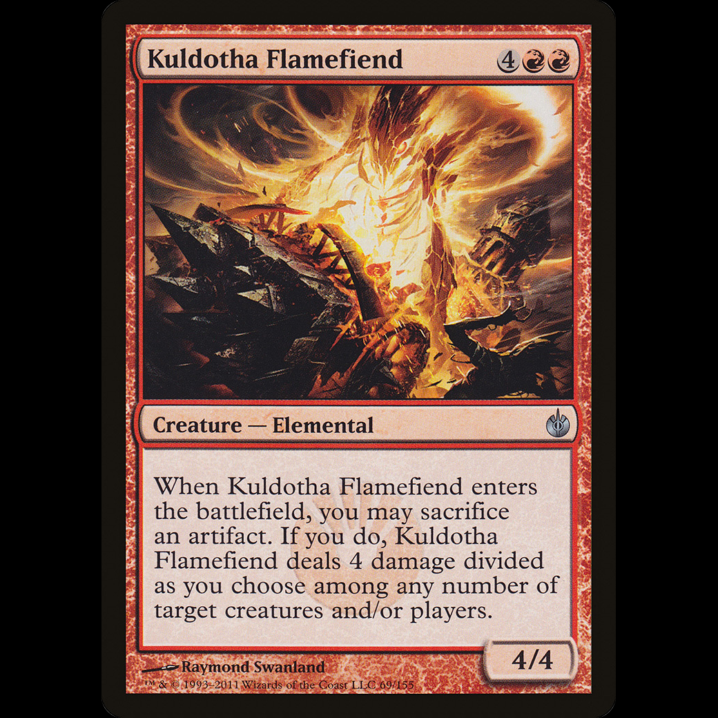 When Kuldotha Flamefiend enters the battlefield, you may sacrifice an artifact. If you do, Kuldotha Flamefiend deals 4 damage divided as you choose among any number of targets.