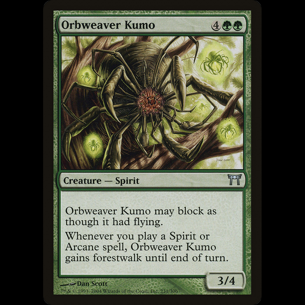 Whenever you cast a Spirit or Arcane spell, Orbweaver Kumo gains forestwalk until end of turn. (It can't be blocked as long as defending player controls a Forest.)