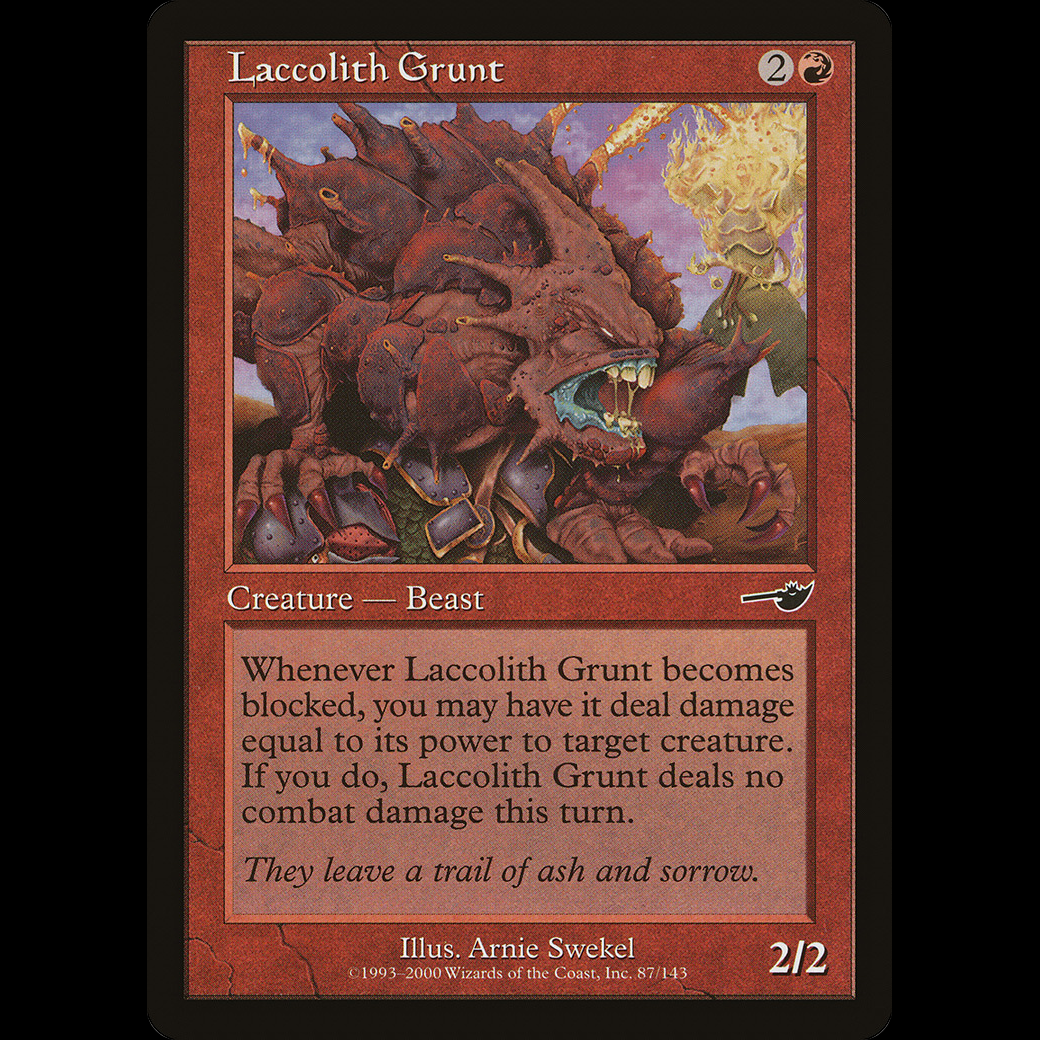 Whenever Laccolith Grunt becomes blocked, you may have it deal damage equal to its power to target creature. If you do, Laccolith Grunt assigns no combat damage this turn.