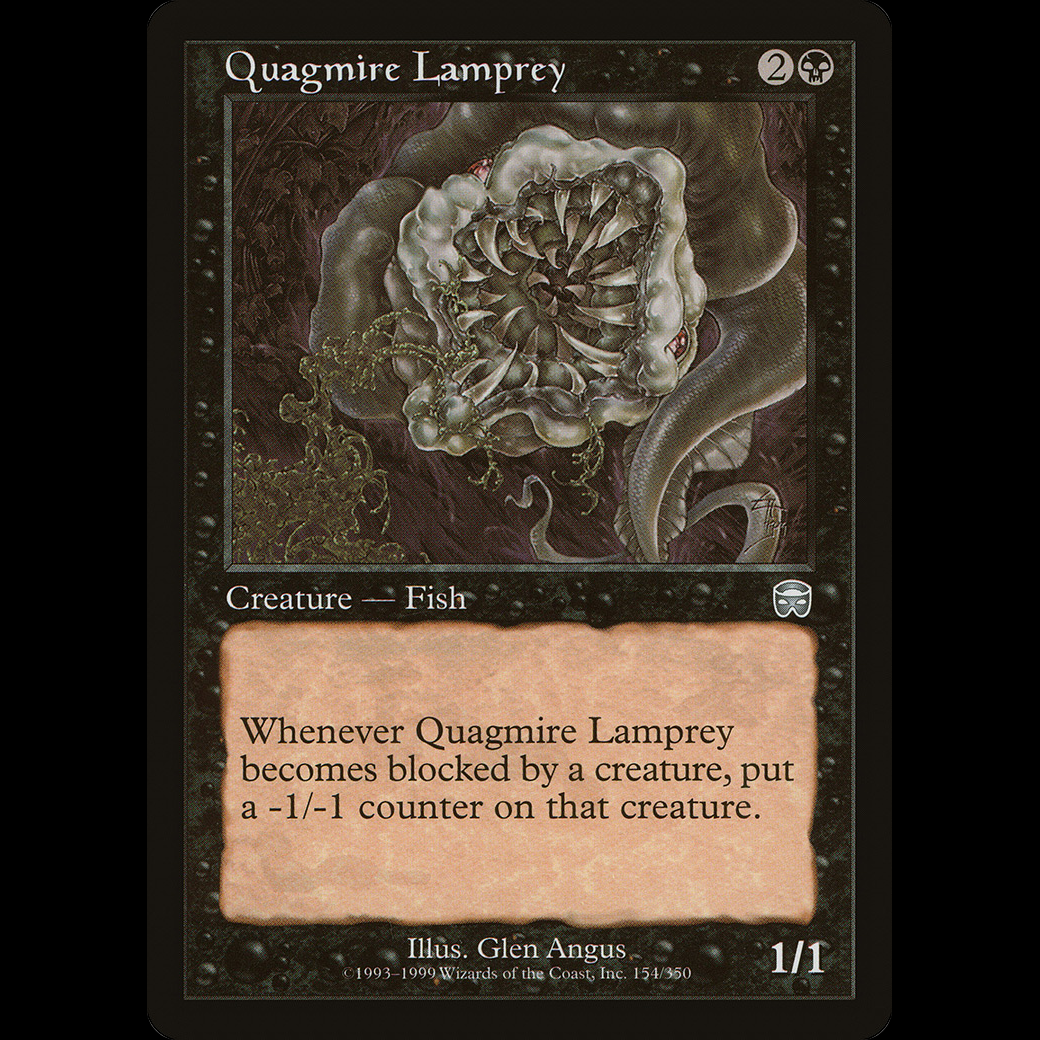 Whenever Quagmire Lamprey becomes blocked by a creature, put a -1/-1 counter on that creature.