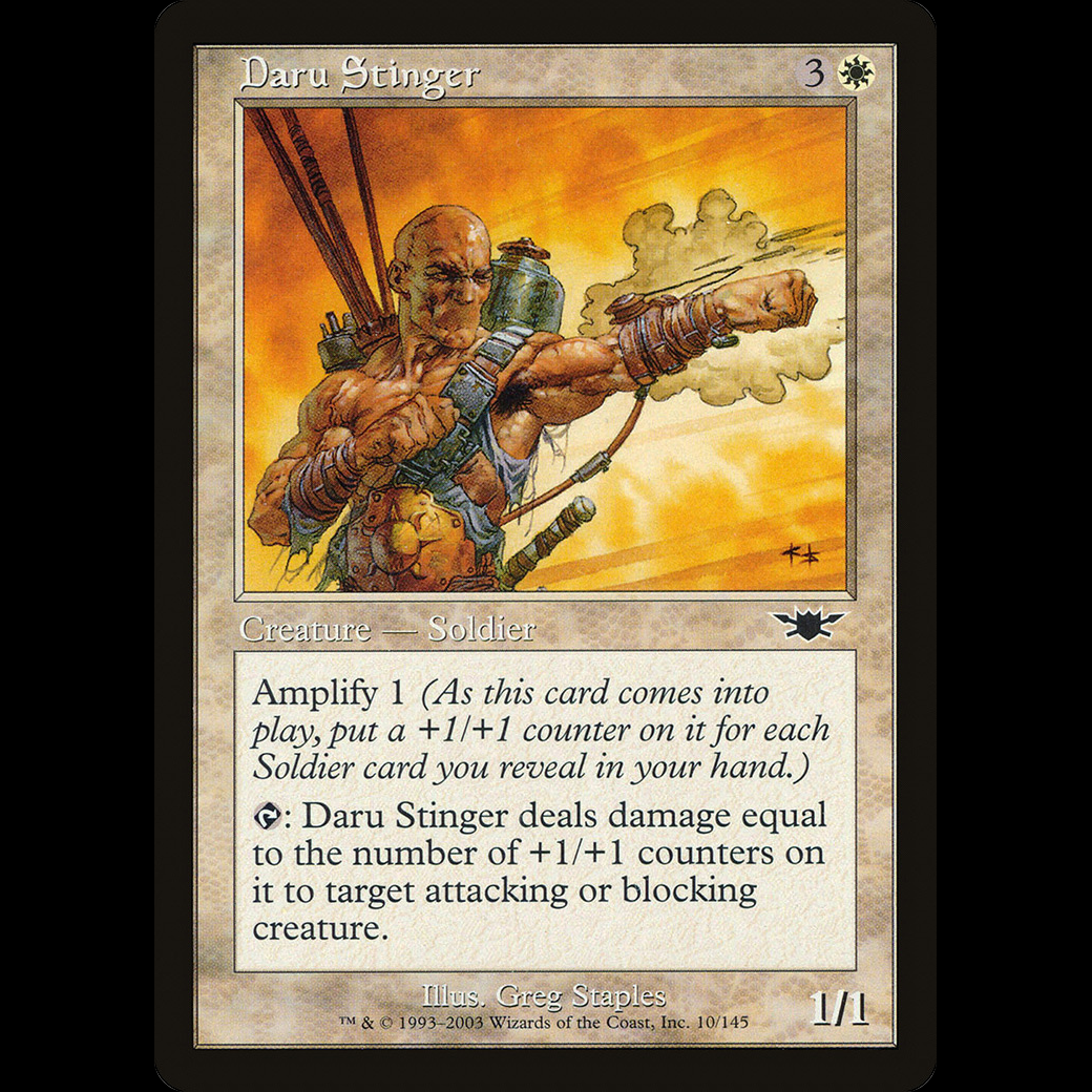 : Daru Stinger deals damage equal to the number of +1/+1 counters on it to target attacking or blocking creature.