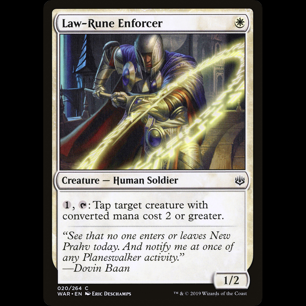 MTG Law-Rune Enforcer War of the Spark war#20, : Tap target creature with mana value 2 or greater.