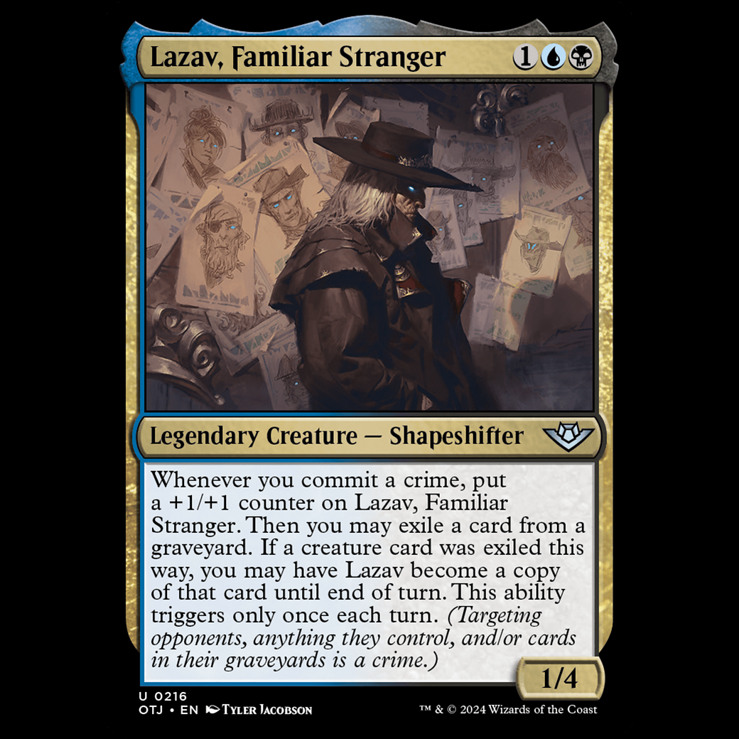 Whenever you commit a crime, put a +1/+1 counter on Lazav, Familiar Stranger. Then you may exile a card from a graveyard. If a creature card was exiled this way, you may have Lazav become a copy of that card until end of turn. This ability triggers only once each turn. (Targeting opponents, anything they control, and/or cards in their graveyards is a crime.)