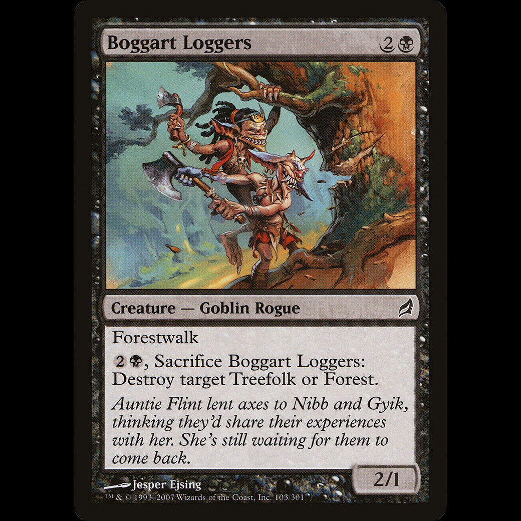 , Sacrifice Boggart Loggers: Destroy target Treefolk or Forest.