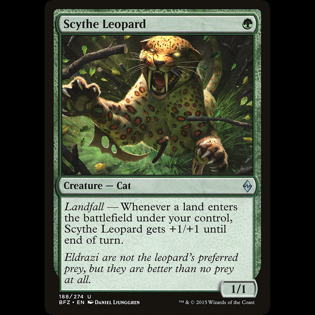 Landfall — Whenever a land enters the battlefield under your control, Scythe Leopard gets +1/+1 until end of turn.