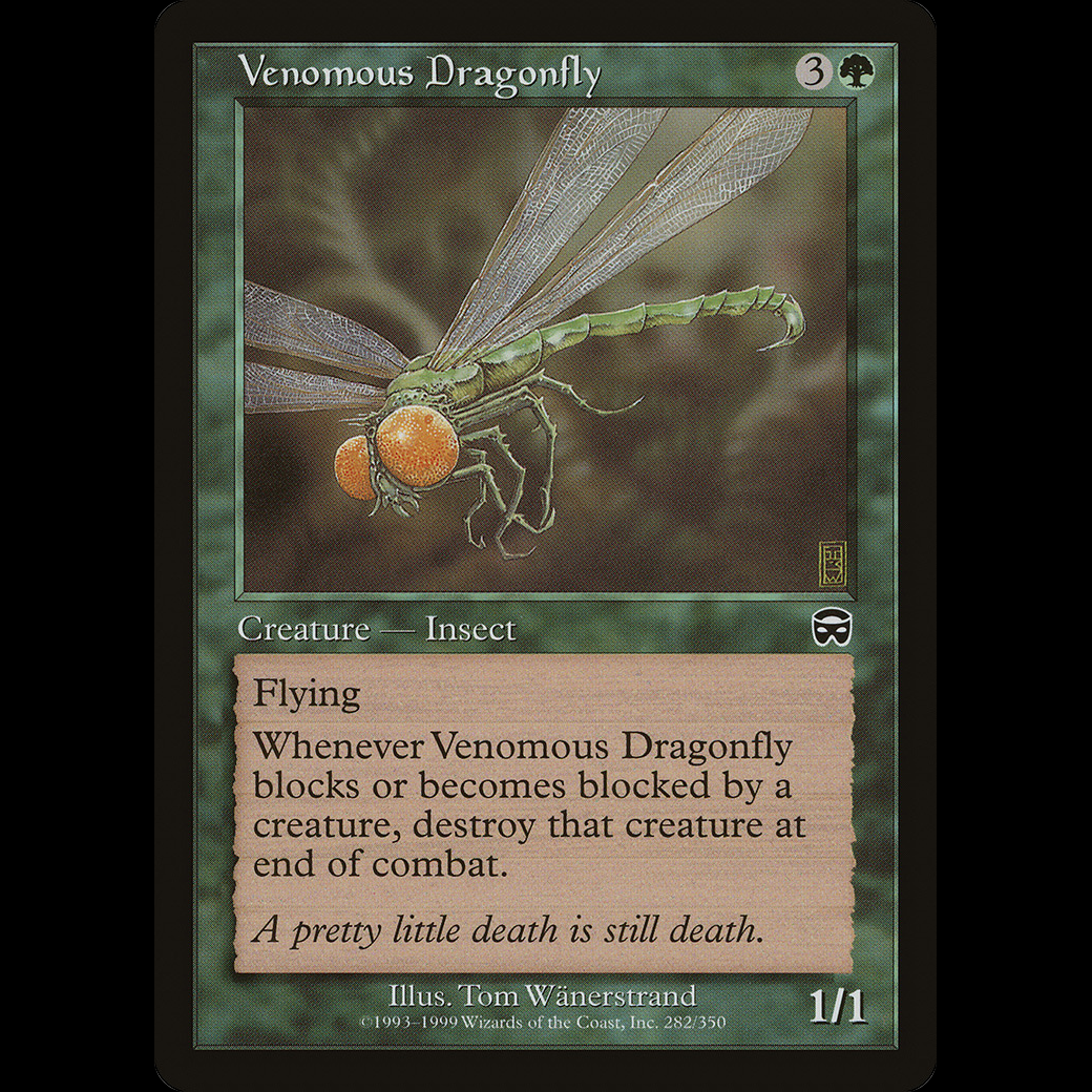 Whenever Venomous Dragonfly blocks or becomes blocked by a creature, destroy that creature at end of combat.