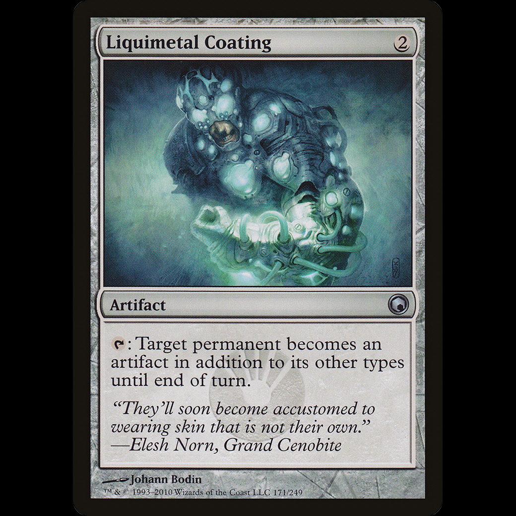 MTG Liquimetal Coating Scars of Mirrodin – PL{T}: Target permanent becomes an artifact in addition to its other types until end of turn.