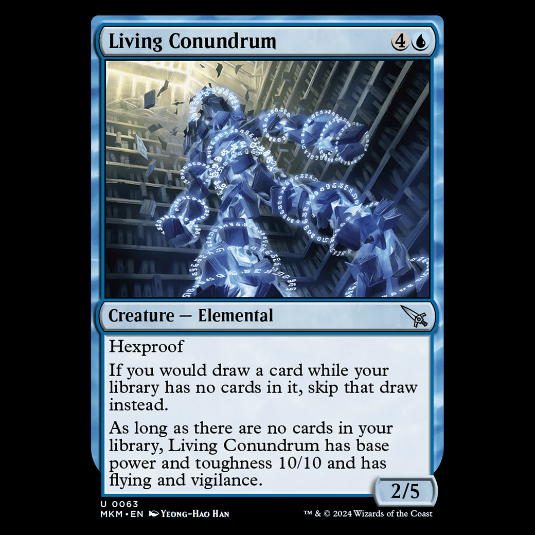 As long as there are no cards in your library, Living Conundrum has base power and toughness 10/10 and has flying and vigilance.