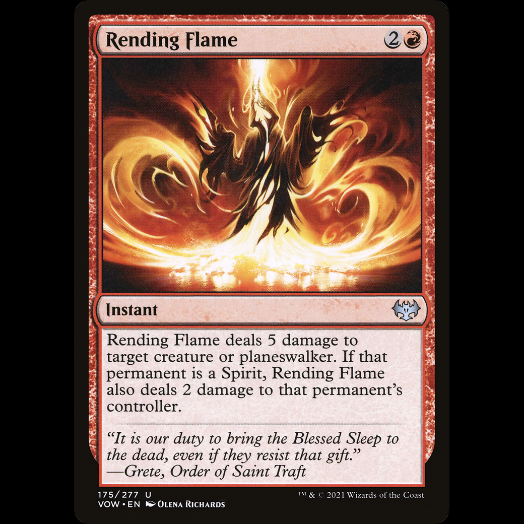 Rending Flame deals 5 damage to target creature or planeswalker. If that permanent is a Spirit, Rending Flame also deals 2 damage to that permanent's controller.