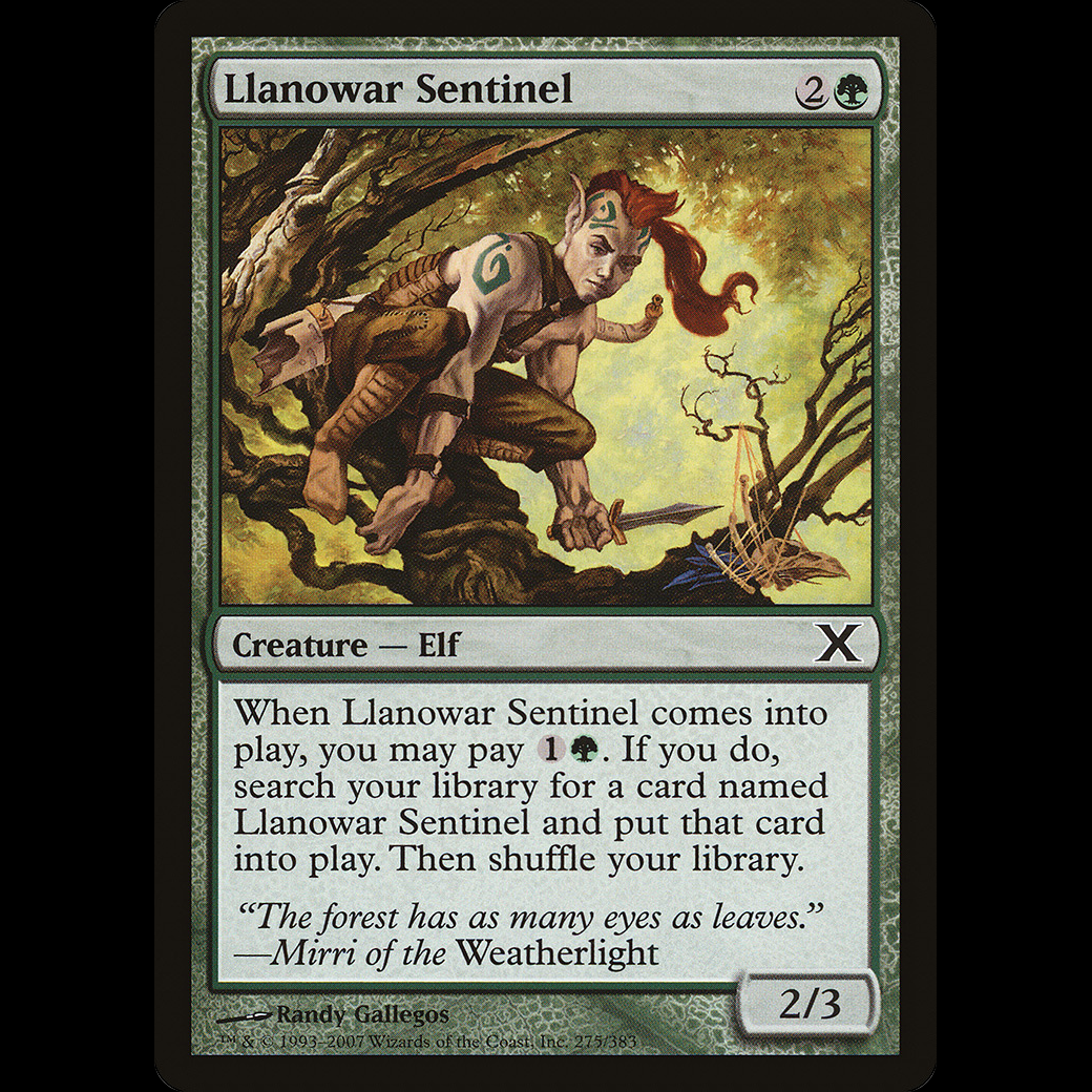 When Llanowar Sentinel enters the battlefield, you may pay . If you do, search your library for a card named Llanowar Sentinel, put that card onto the battlefield, then shuffle.