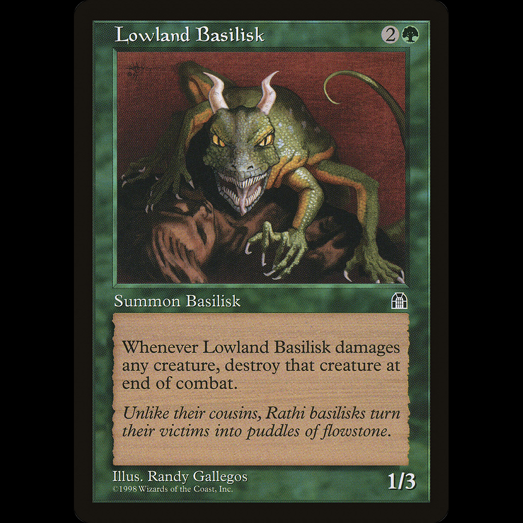 Whenever Lowland Basilisk deals damage to a creature, destroy that creature at end of combat.