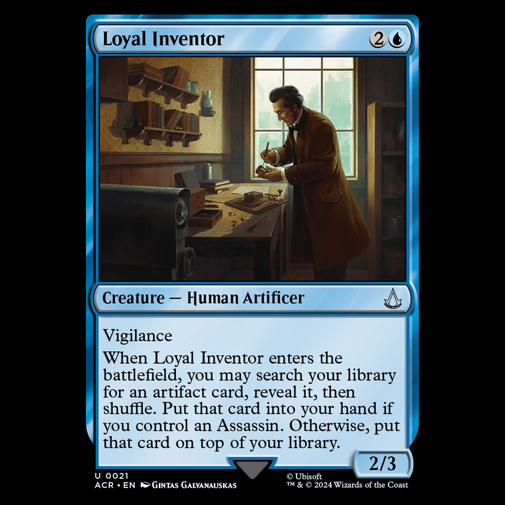 When Loyal Inventor enters the battlefield, you may search your library for an artifact card, reveal it, then shuffle. Put that card into your hand if you control an Assassin. Otherwise, put that card on top of your library.