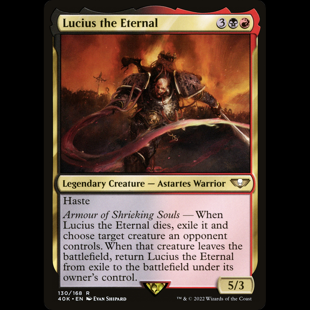 MTG Lucius the Eternal Warhammer 40,000 Commander 40k#130 Haste Armour of Shrieking Souls — When Lucius the Eternal dies, exile it and choose target creature an opponent controls. When that creature leaves the battlefield, return Lucius the Eternal from exile to the battlefield under its owner's control.