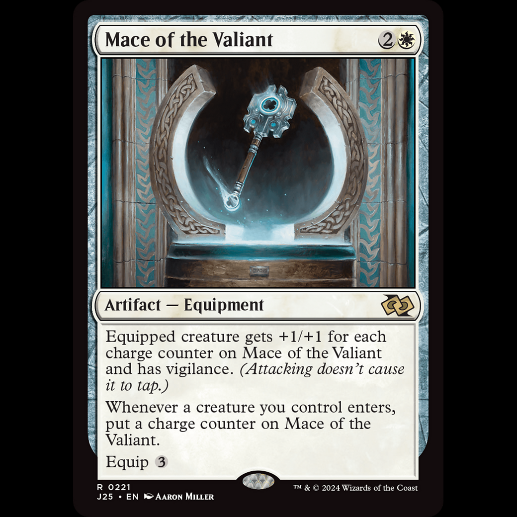 MTG Mace of the Valiant Foundations Jumpstart j25#221 Equipped creature gets +1/+1 for each charge counter on Mace of the Valiant and has vigilance. (Attacking doesn't cause it to tap.) Whenever a creature you control enters, put a charge counter on Mace of the Valiant. Equip