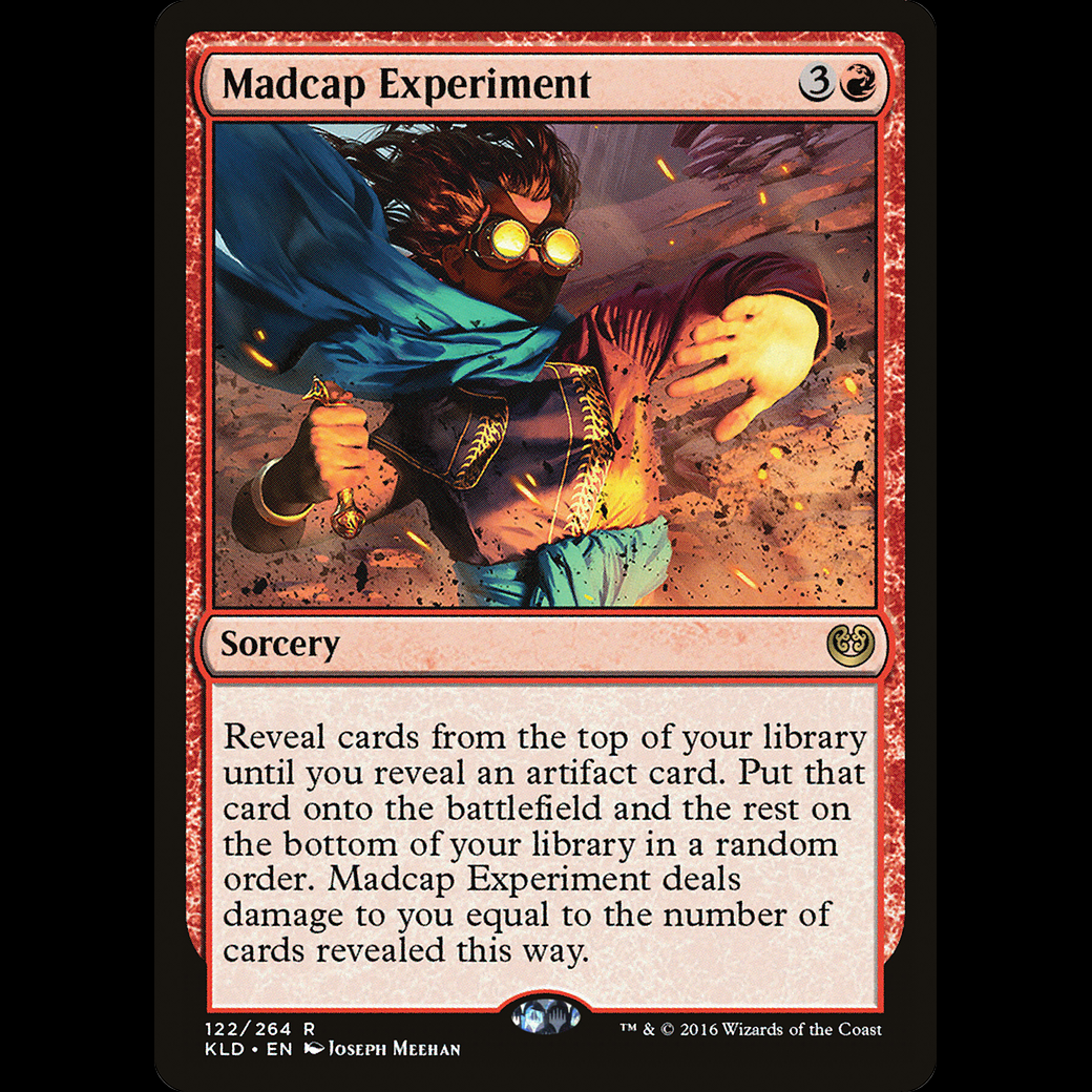 Reveal cards from the top of your library until you reveal an artifact card. Put that card onto the battlefield and the rest on the bottom of your library in a random order. Madcap Experiment deals damage to you equal to the number of cards revealed this way.