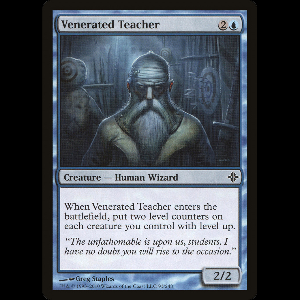 When Venerated Teacher enters the battlefield, put two level counters on each creature you control with level up.
