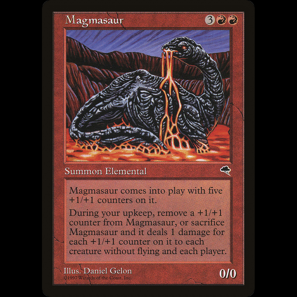 At the beginning of your upkeep, you may remove a +1/+1 counter from Magmasaur. If you don't, sacrifice Magmasaur and it deals damage equal to the number of +1/+1 counters on it to each creature without flying and each player.