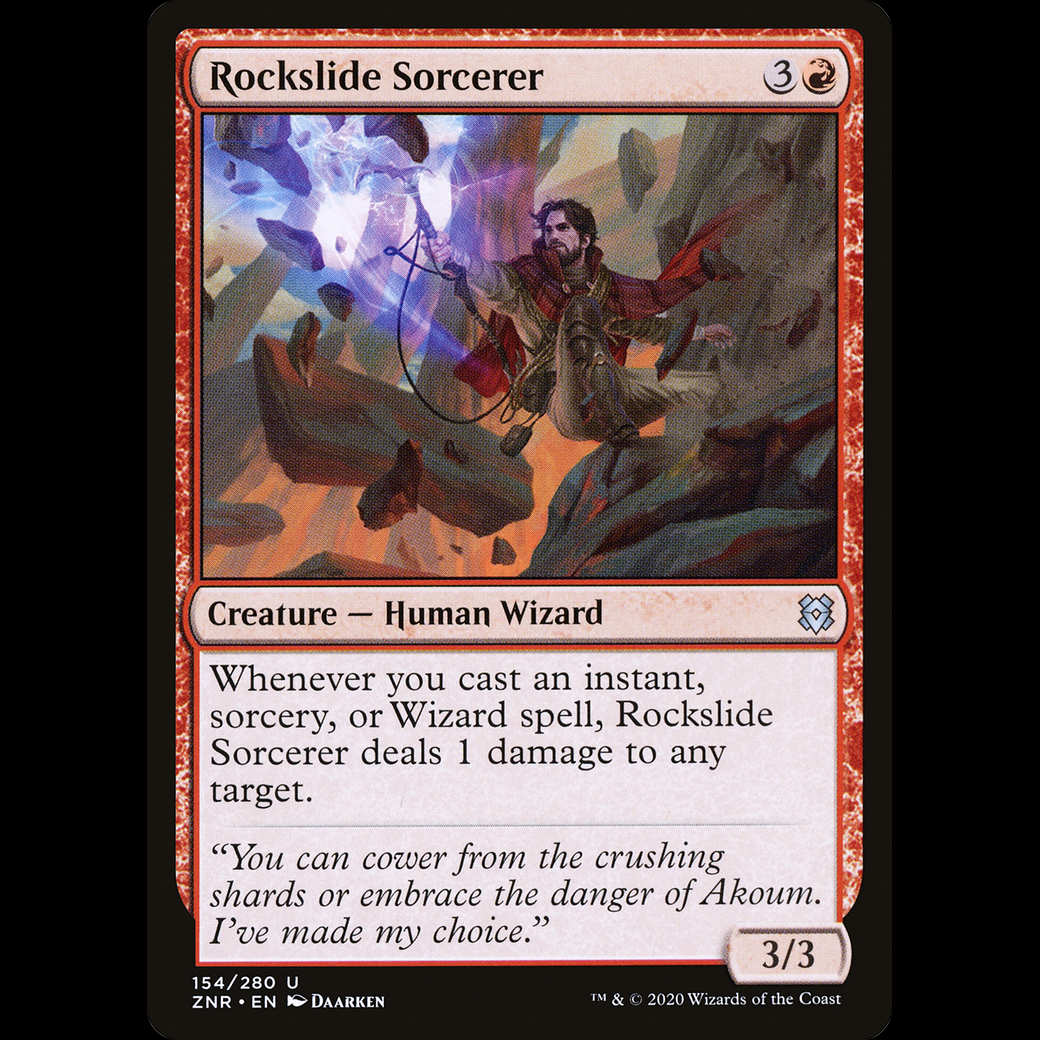 MTG Mago de desprendimientos (Rockslide Sorcerer) Zendikar Rising znr#154Whenever you cast an instant, sorcery, or Wizard spell, this creature deals 1 damage to any target.