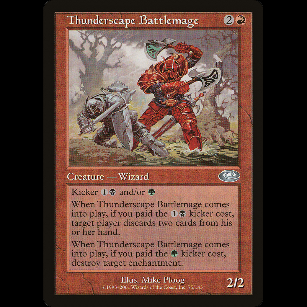 When Thunderscape Battlemage enters the battlefield, if it was kicked with its kicker, target player discards two cards.