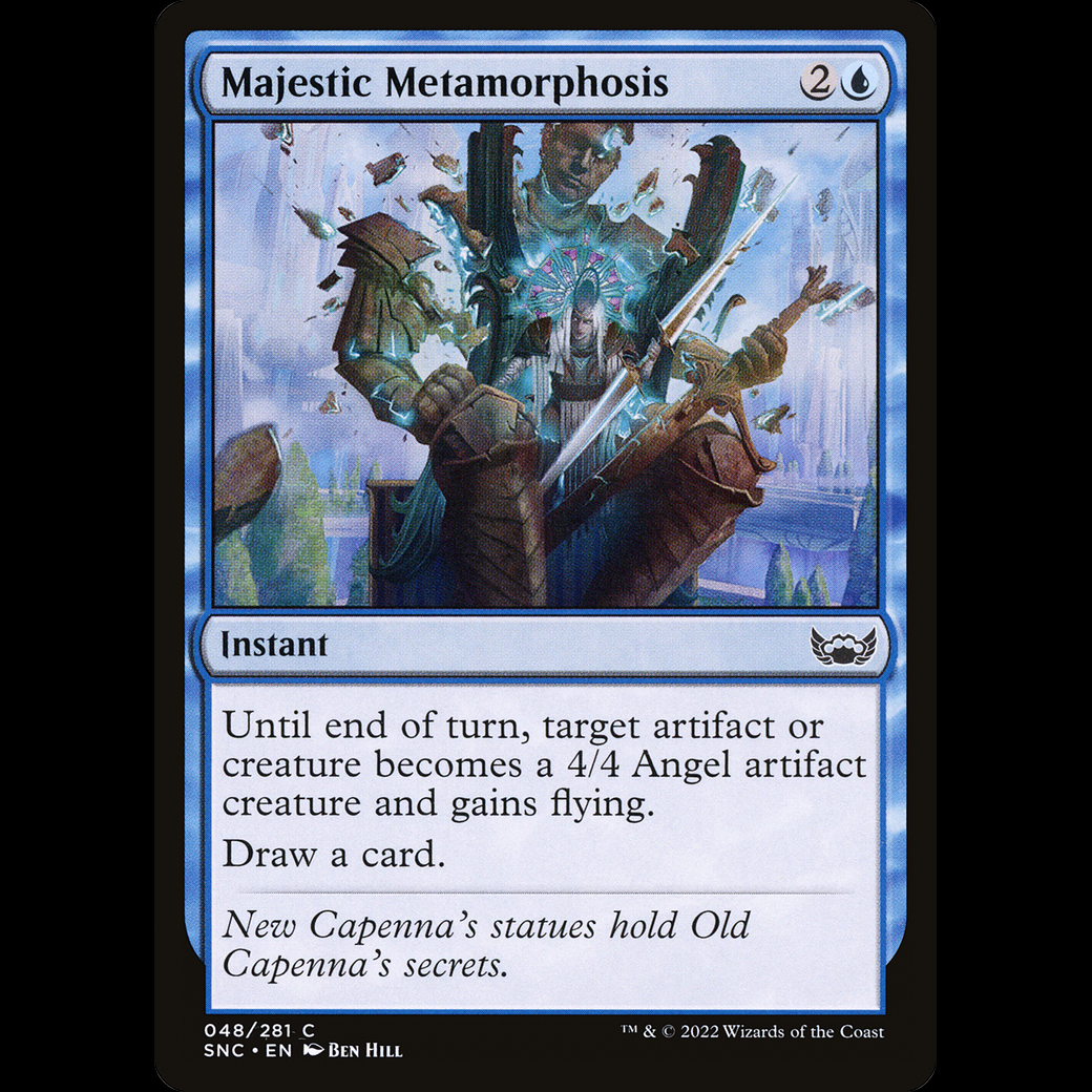 MTG Majestic Metamorphosis Streets of New Capenna snc#48Until end of turn, target artifact or creature becomes a 4/4 Angel artifact creature and gains flying. Draw a card.