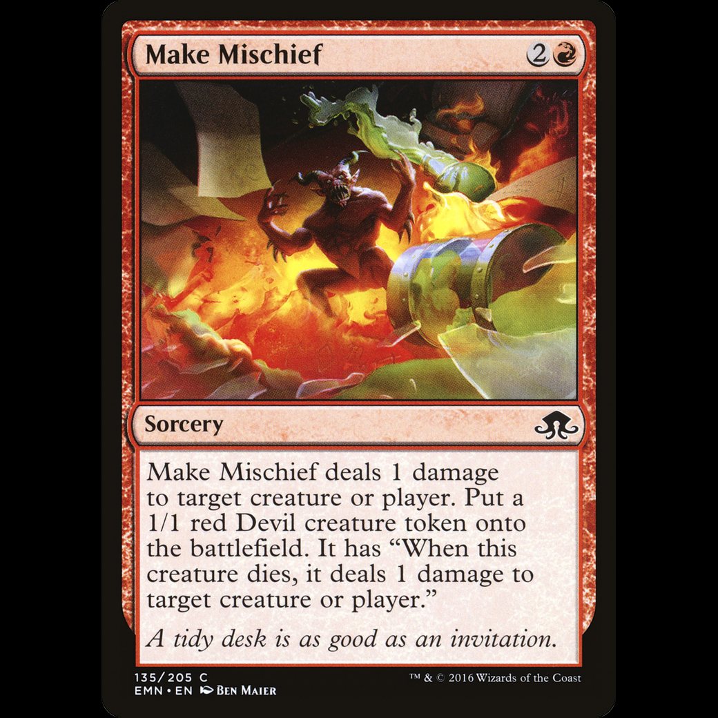 Make Mischief deals 1 damage to any target. Create a 1/1 red Devil creature token. It has