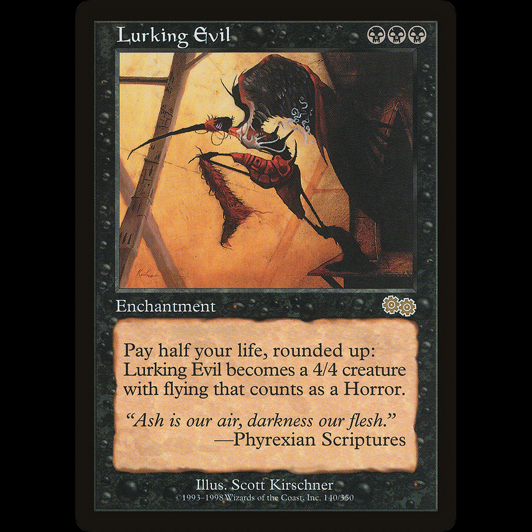 Pay half your life, rounded up: Lurking Evil becomes a 4/4 Phyrexian Horror creature with flying.