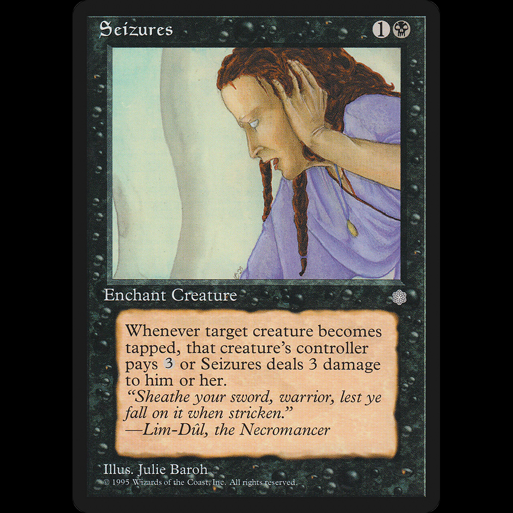 Whenever enchanted creature becomes tapped, Seizures deals 3 damage to that creature's controller unless that player pays .