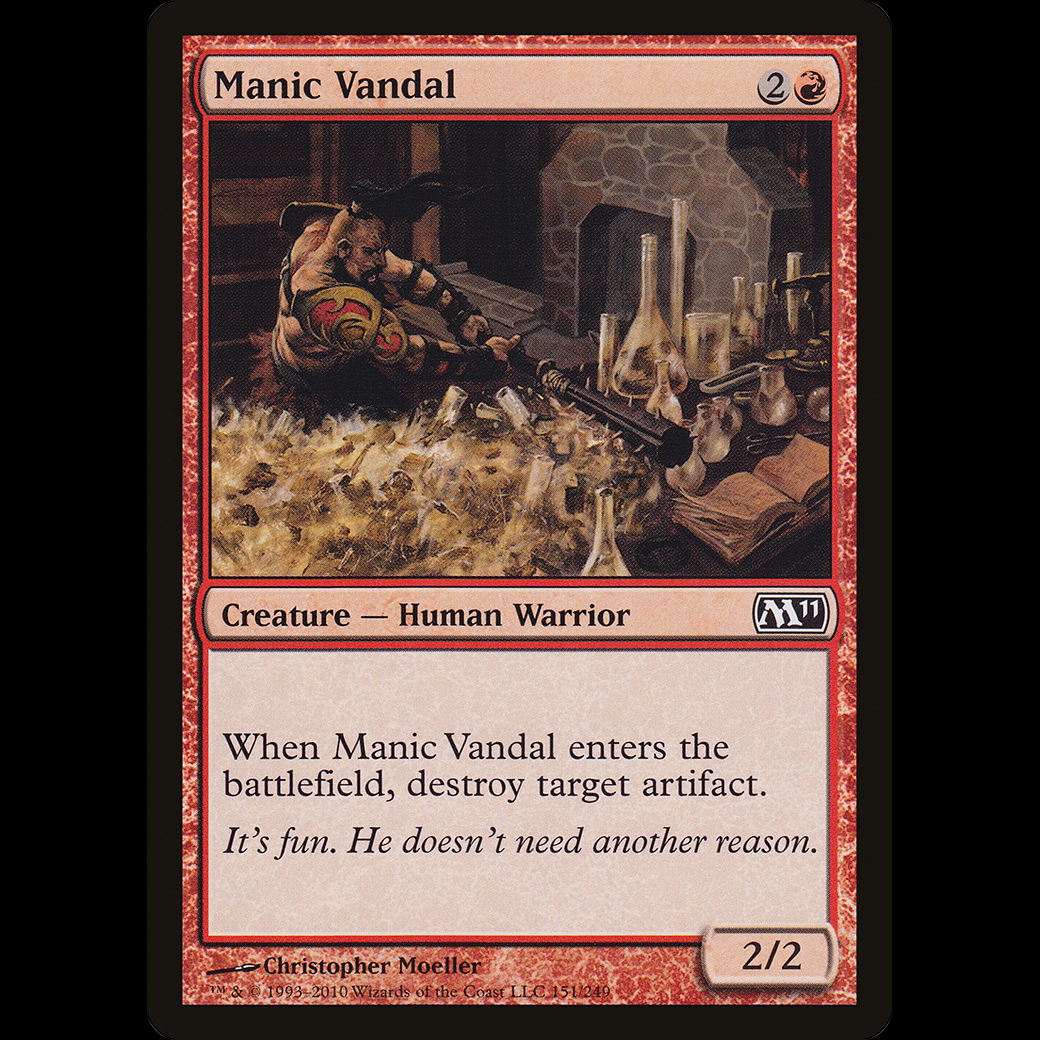 MTG Manic Vandal Magic 2011When Manic Vandal enters the battlefield, destroy target artifact.