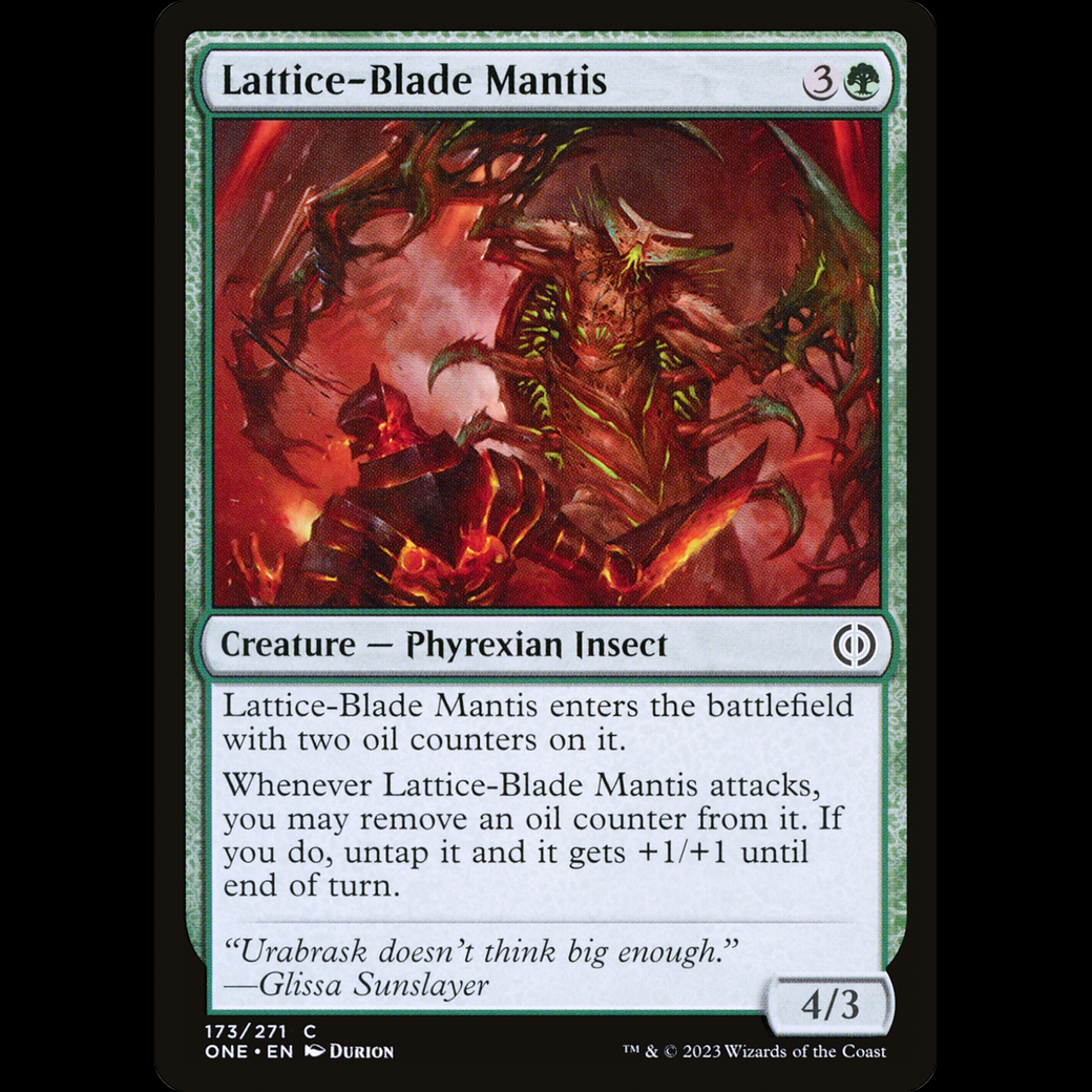 Whenever Lattice-Blade Mantis attacks, you may remove an oil counter from it. If you do, untap it and it gets +1/+1 until end of turn.