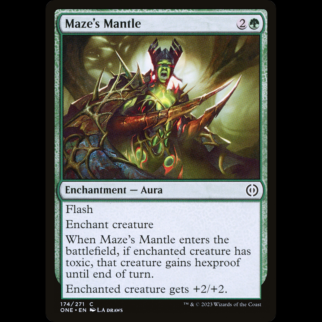 When Maze's Mantle enters, if enchanted creature has toxic, that creature gains hexproof until end of turn.