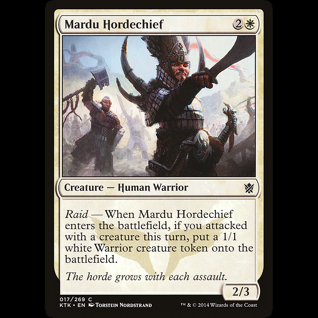 Raid — When Mardu Hordechief enters the battlefield, if you attacked this turn, create a 1/1 white Warrior creature token.