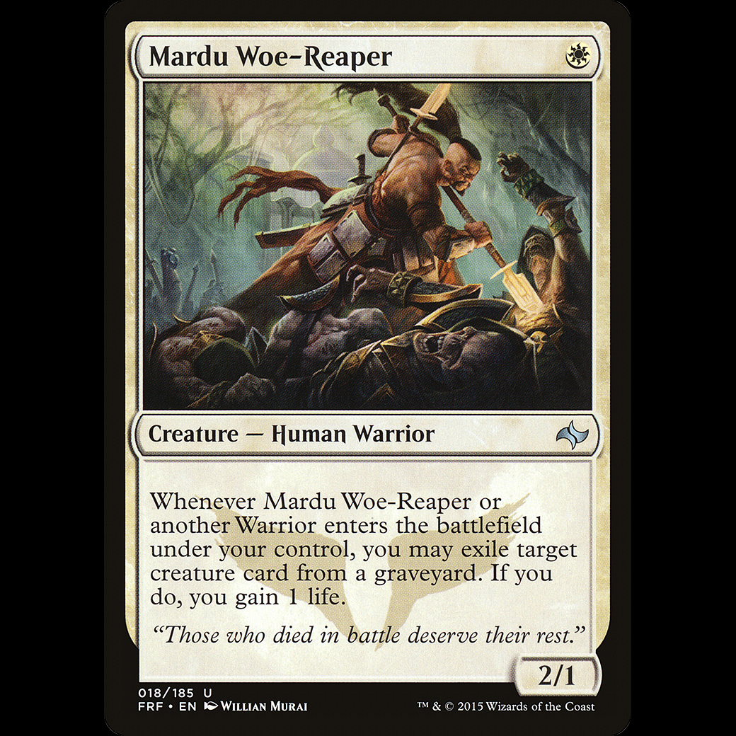 Whenever Mardu Woe-Reaper or another Warrior enters the battlefield under your control, you may exile target creature card from a graveyard. If you do, you gain 1 life.